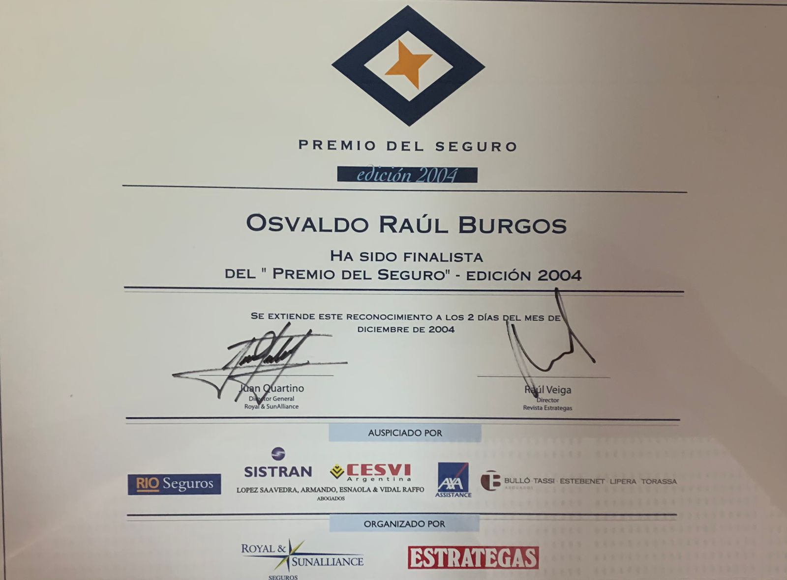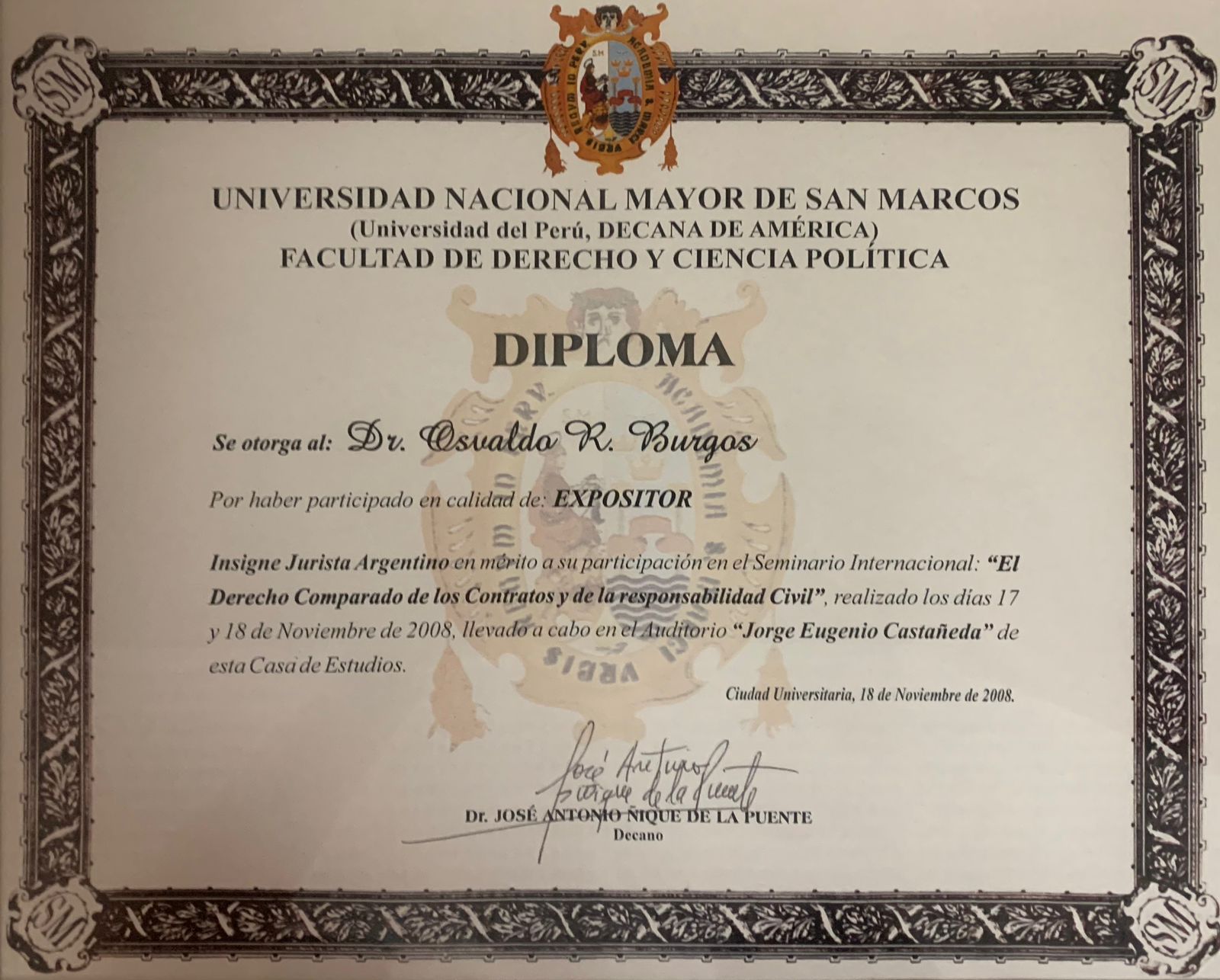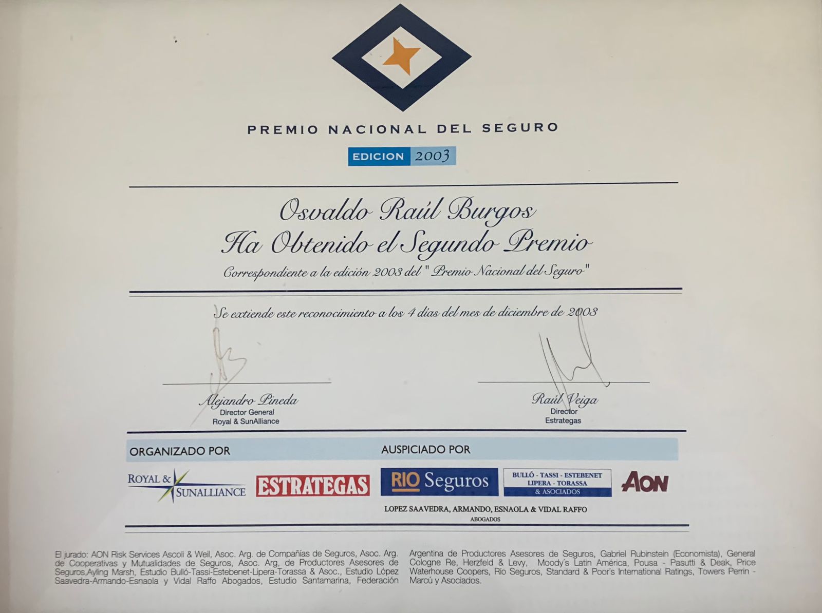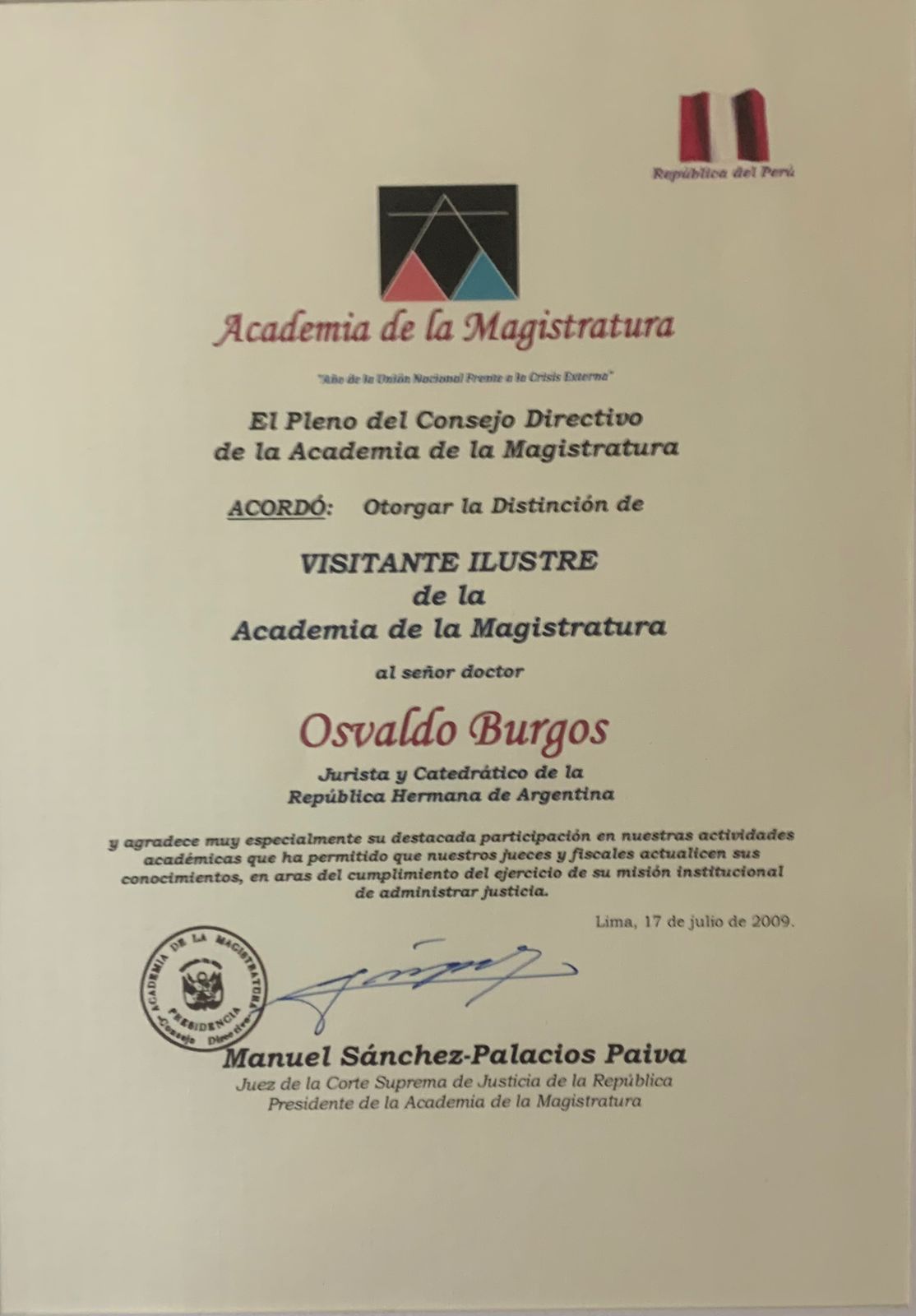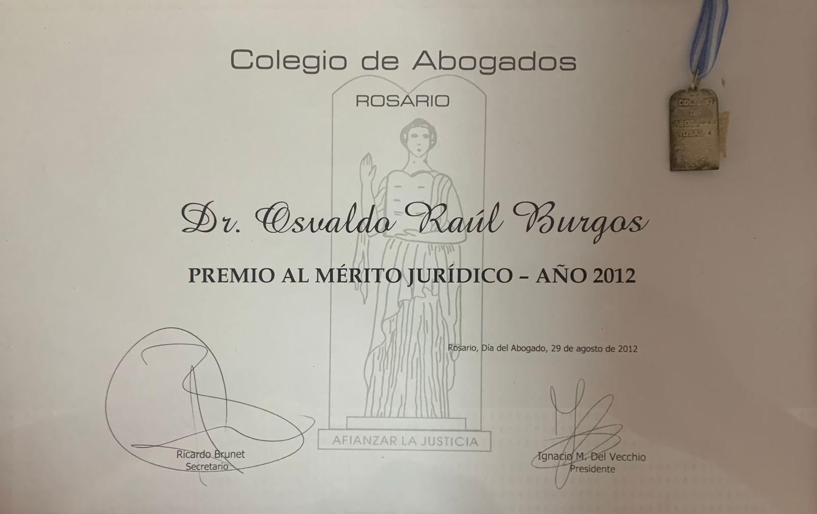 Finalista Premio del Seguro 2001 / 2do. Premio Nacional del Seguro 2003 / Finalista Premio Nacional del Seguro 2004 / Visitante Ilustre Academia Nacional de la Magistratura de Perú 2009 / Honrado en Perú con el "Concurso Jurídico y Humanista Osvaldo R. Burgos" 2010 / Premio al Mérito Jurídico Colegio de Abogados de Rosario (Arg.) 2012/ 4to. Premio Certamen Internacional de Estudios Críticos Sobre la Justicia, Instituto Iberoamericano de La Haya 2020.